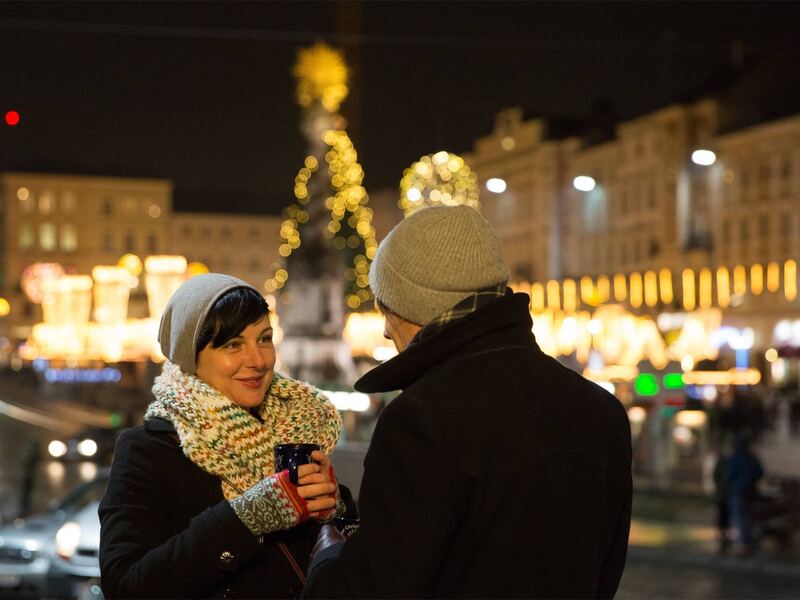 Dem Besucher von der Schmidttorgasse oder von der Nibelungenbrücke kommend bietet sich ein einzigartiger Anblick. Eingebettet in die jahrhundertalten barocken Bürgerhäuser erhebt sich vor unseren Augen ein wahres Adventjuwel. Es glitzert und gleißt nur so on allen Ecken und Enden, lieblich gestaltete Stände umringen den imposanten Weihnachtsbaum und laden zum Verweilen ein. Durch die Anordnung der Marktstandl'n ergibt sich für den Besucher die Möglichkeit jeden Stand ohne Gedränge und Geschiebe ansteuern zu können. Der Christkindlmarkt am Linzer Hauptplatz versteht sich seit jeher als der Markt der Künstler und Kunsthandwerker. So zählen 3 Kunstmaler zu den Gründungsmitgliedern und sind hier selbst heute noch vertreten. Dem Käufer bietet sich auf diesem Markt eine großangelegte Palette von selbst gefertigtem Christbaumschmuck, Töpfer- und Glaswaren, Modeschmuck, in althergebrachter filigraner Manier bis hin zu italienischer Glashüttenkunst. Selbstverständlich kann der Besucher mit köstlichsten heißen Getränken, Bratwürsteln und Bauernkrapfen seinen Hunger und Durst stillen.