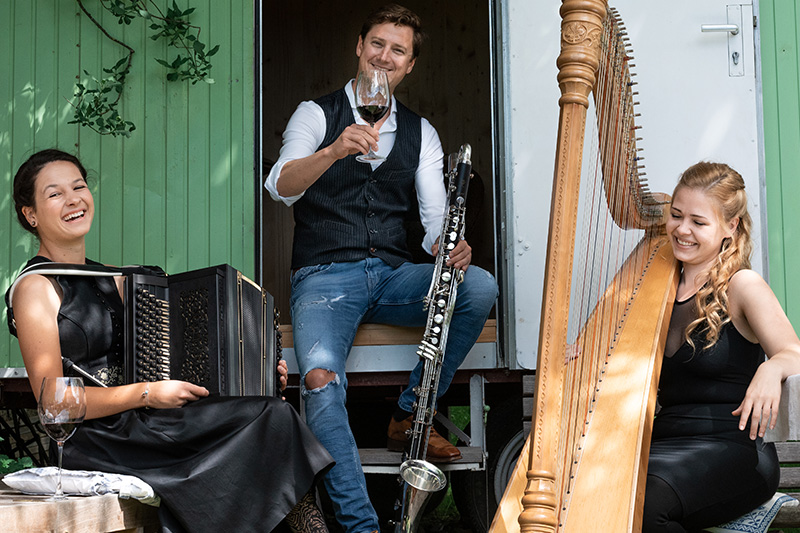 Was als kammermusikalisches Studienprojekt an der Anton Bruckner Privatuniversität Linz begann, hat sich mittlerweile als erfrischend professionelles Trio am Weg zwischen Tradition und Moderne etabliert. Das junge Trio, bestehend aus Katharina Baschinger (Feldkirchen an der Donau), Theresa Lehner (Steyregg) und Alexander Maurer (Berndorf bei Salzburg), beleuchtet die klanglichen Facetten der Steirischen Harmonika sowohl im traditionell-volksmusikalischen als auch im experimentierfreudig-innovativen Kontext. Steirische Harmonika trifft dabei auf Hackbrett, Harfe, Bassklarinette und Gesang – Eigenkompositionen werden mit Musik von so unterschiedlichen Persönlichkeiten wie George Gershwin, Elvis Presley oder Nina Simone gepaart. Diatonische Expeditionen – eine vielschichtige Reise quer durch die Musiklandschaft.