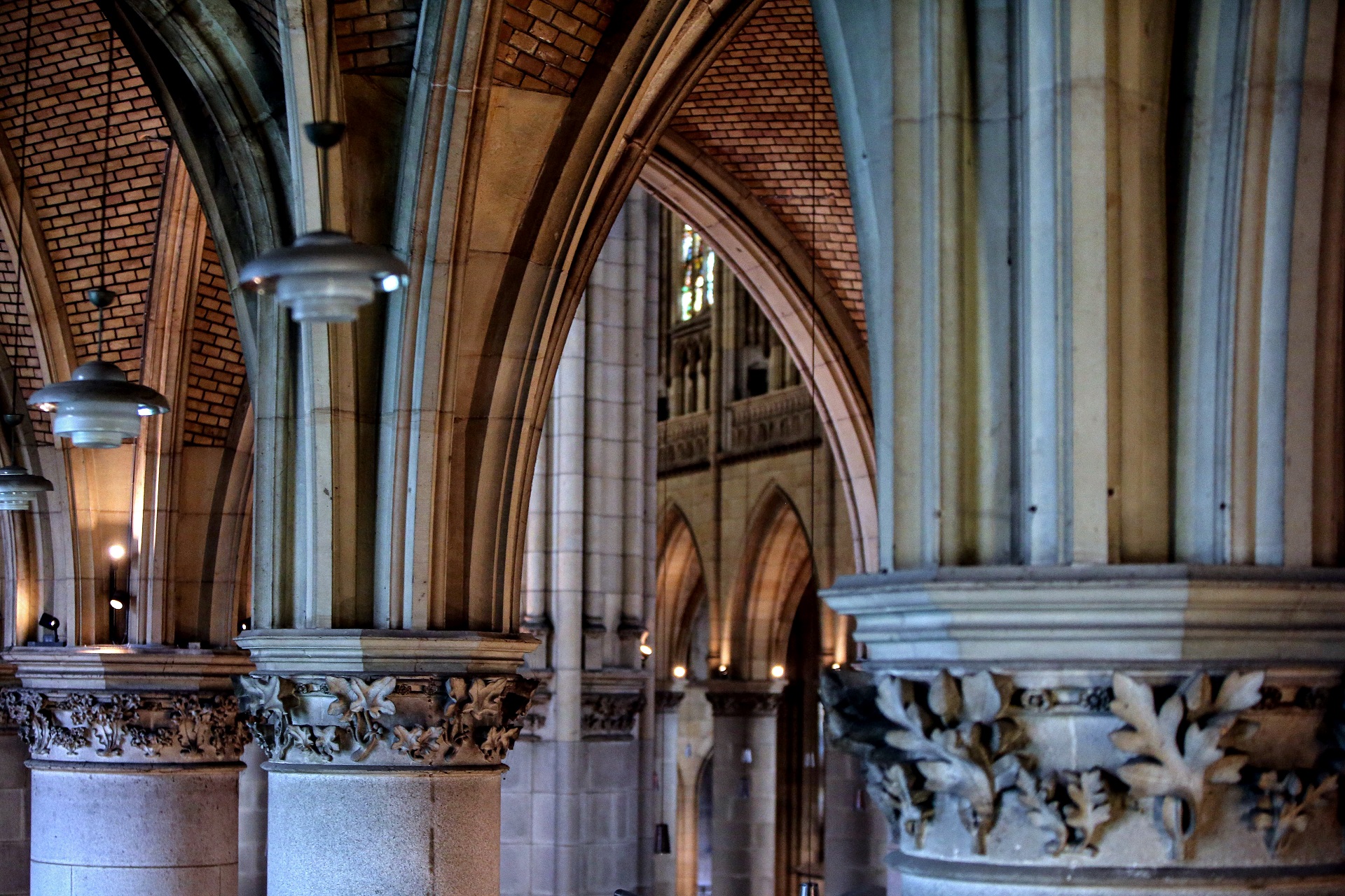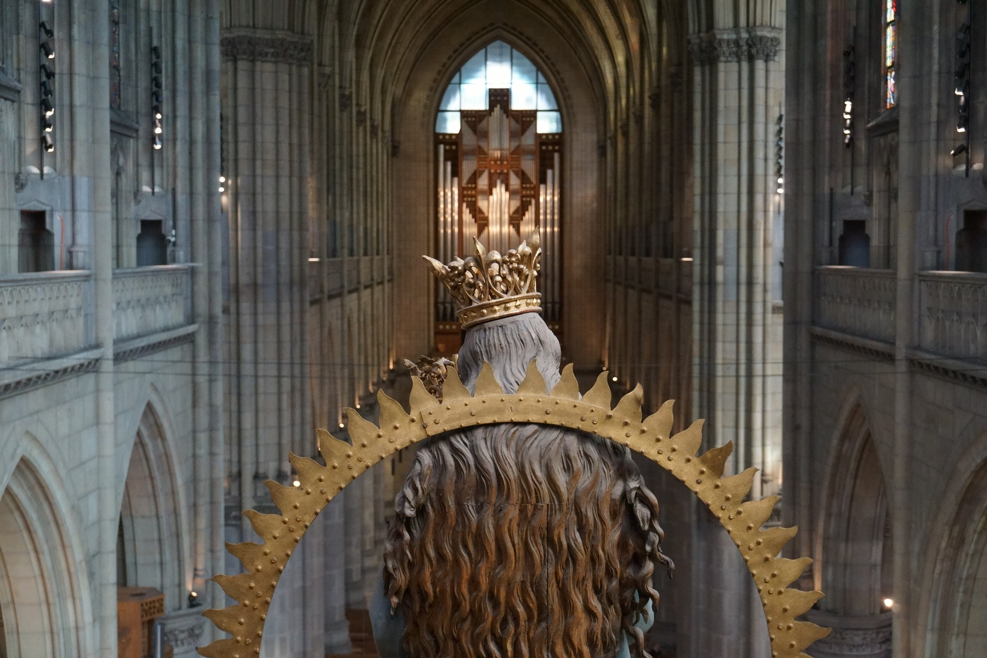 Vom Erdgeschoss führt der Weg über „geheime“ Wendeltreppen auf die Innengalerie (86 Stufen), von der man die großen Rosettenfenster und Gemäldefenster aus unmittelbarer Nähe erleben kann.