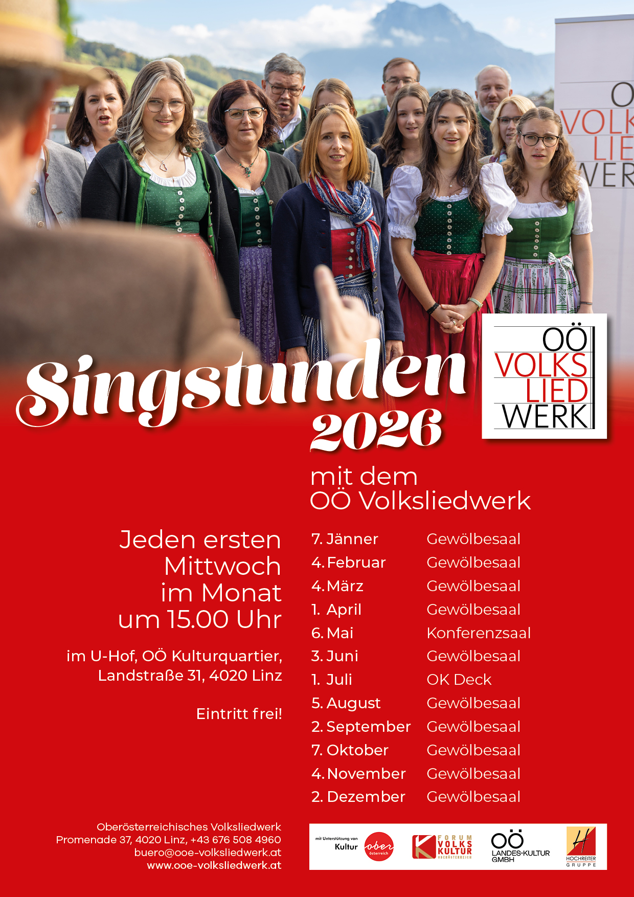 Das OÖ. Volksliedwerk lädt jeden ersten Mittwoch im Monat zu einer gemeinsamen Singstunde. Mit Jahreszeitenliedern, lustigen Volksliedern und feinen Jodlern begleiten SingleiterInnen durch diese gemeinsame Stunde. Das Notenmaterial wird vom OÖ. Volksliedwerk zur Verfügung gestellt. Es sind keine Vorkenntnisse notwendig. Mitzubringen ist einfach die Freude am gemeinsamen Singen.