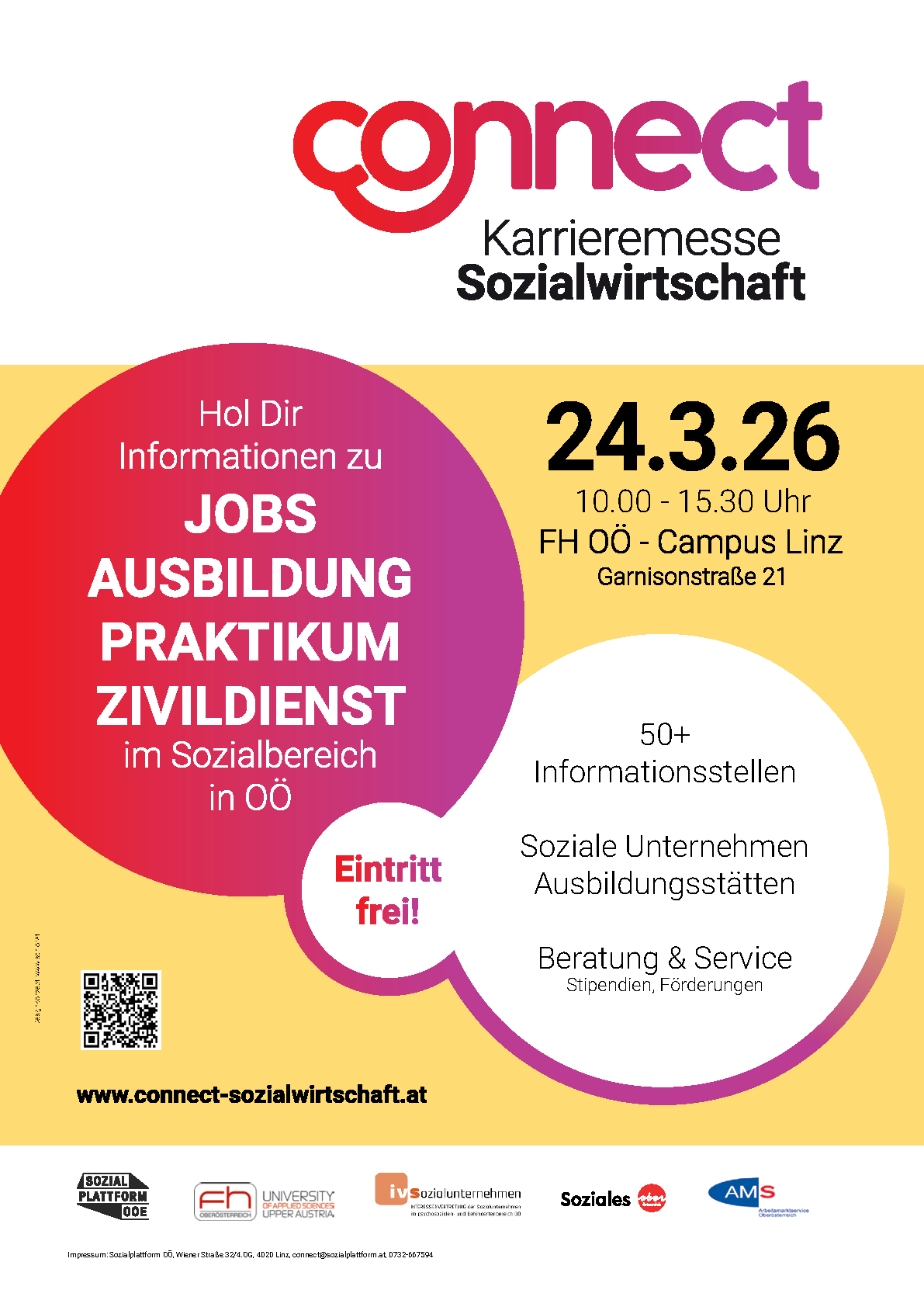 Junge Erwachsene, Wiedereinsteigerinnen, aber auch viele Berufstätige auf der Suche nach einem neuen Karriereweg besuchen die Connect, die heuer zum sechsten Mal stattfindet. Sozialplattform OÖ, IV Sozialunternehmen und Fachhochschule OÖ sind die Veranstalter dieser beliebten Job- und Ausbildungsmesse für Oberösterreich, bei der sich auch die Sozialwirtschaft vernetzen kann.