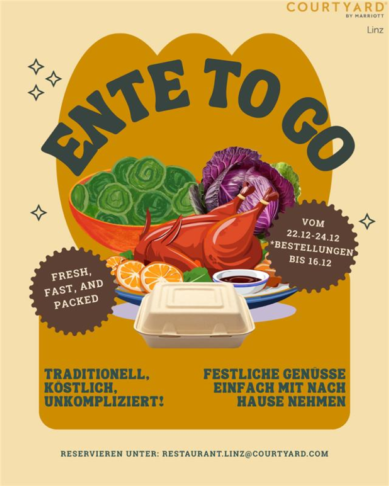 📦 Bestellt eure Ente To Go bis 16.12. per E-Mail an restaurant.linz@courtyard.com (mit vollständigem Namen, Telefonnummer, Abholtermin).