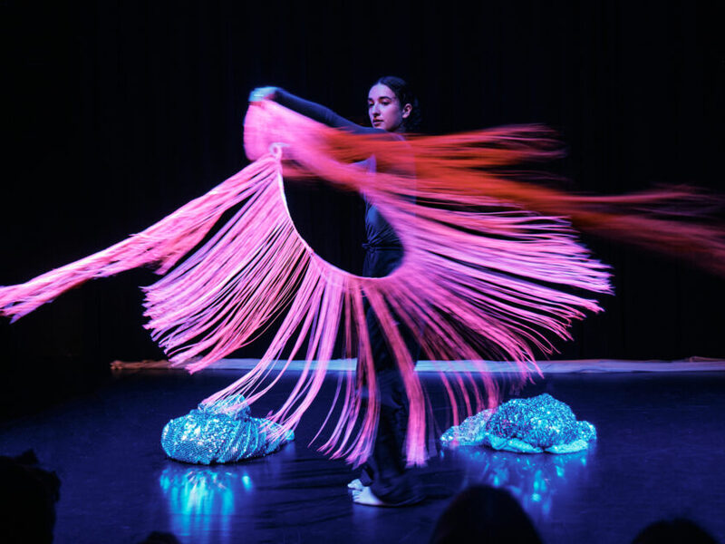 Die Toihaus Produktion „Flow“ ist eine Einladung zum Spüren. In Begleitung von live gespielter Gitarre erkunden zwei Performerinnen mit viel Gefühl verschiedenartige Textilien, drehen, wenden und werfen sie. Seidige Flügelschläge, schimmernde Plättchen – oder doch ein Faden, der scheint?