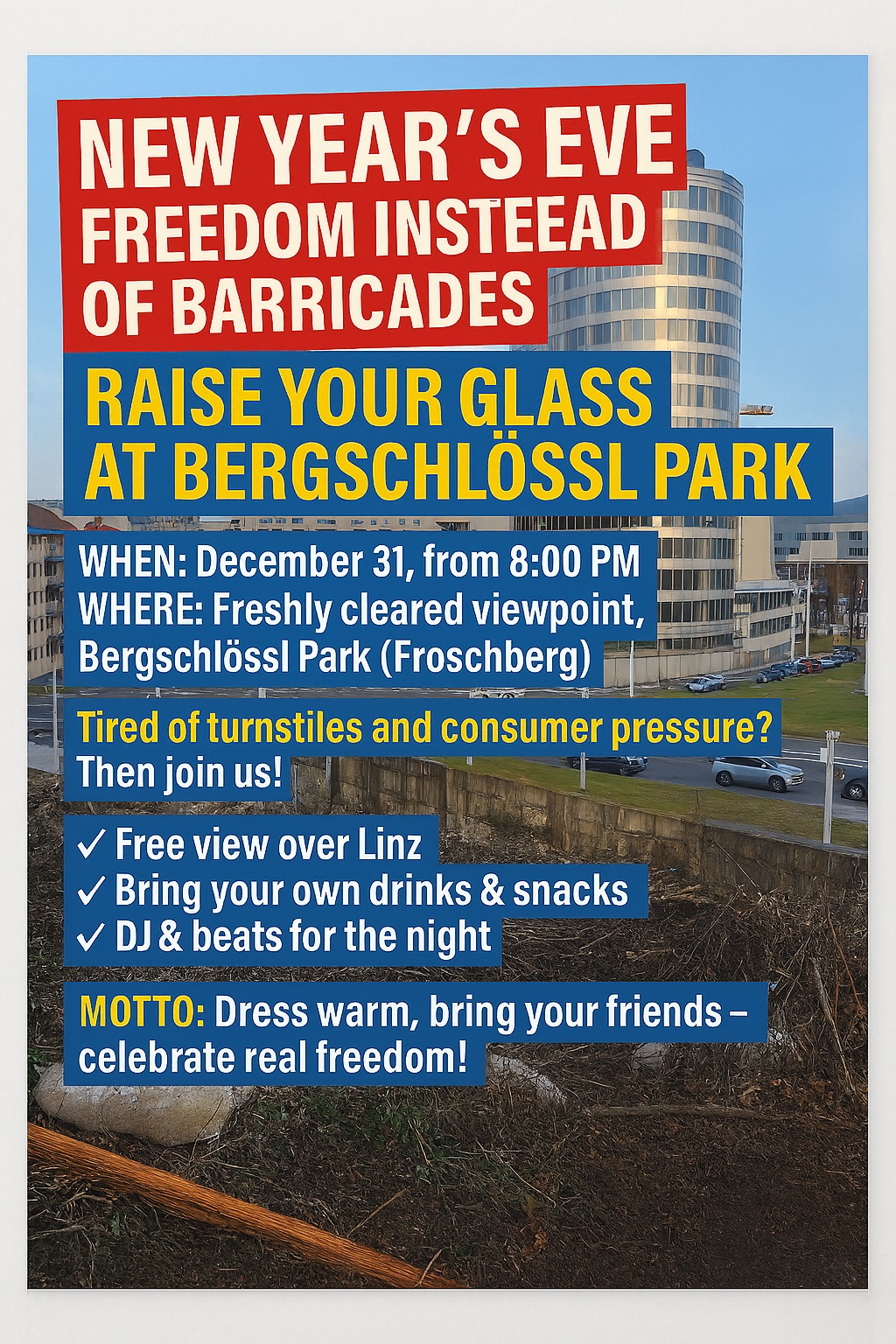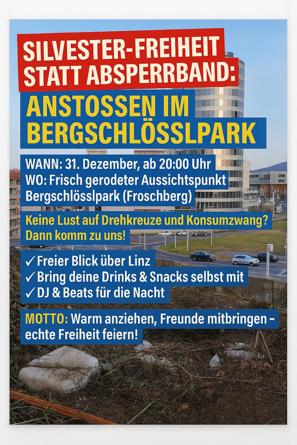 ASFINAG Panorama View: Enjoy an unobstructed view over Linz! A huge thanks to ASFINAG, whose "courageous" clearing measures (who needs trees anyway?) have carved out a path for the perfect view of the fireworks.