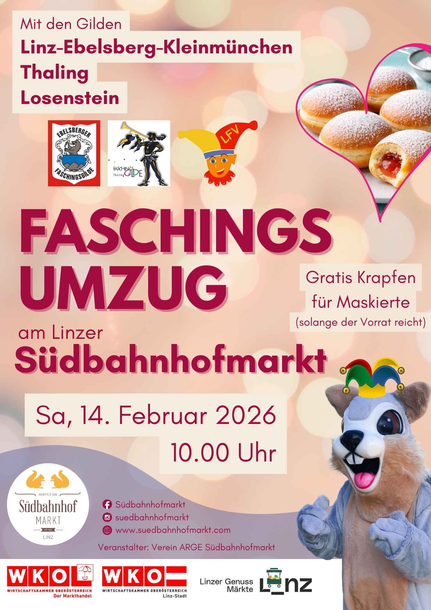Wenn der Fasching seinen Höhepunkt erreicht, verwandelt sich der Linzer Südbahnhofmarkt wieder in einen Ort voller Farben, Musik und guter Laune. Am Samstag, 14. Februar 2026, lädt der Markt ab 10.00 Uhr zum traditionellen Faschingsumzug ein und bietet Besucherinnen und Besuchern ein fröhliches Spektakel mitten im Marktgeschehen.