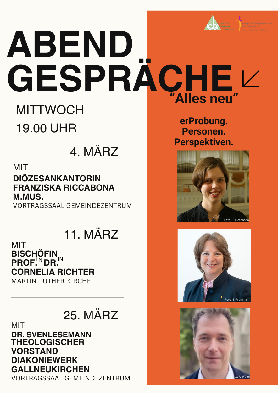 Fr. Riccabona wird den Abend zum neuen evangelischen Gesangbuch gestalten. Es wird alte und neue Lieder vereinen und unsere bisherigen Bücher ersetzen. Unsere Pfarrgemeinde wurde ausgewählt, einen Teil des geplanten neuen Gesangbuches in der Praxis zu erproben. Beim Abendgespräch gibt die Diözesankantorin einen Überblick über die Geschichte der evangelischen Gesangbücher und den Entwicklungsstand des neuen Gesangbuches.