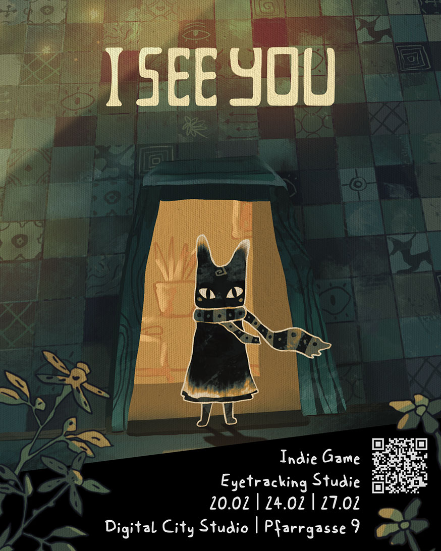 Alle Videospielbegeisterten sind herzlich eingeladen, an der Weiterentwicklung des Indie Games "I see you mitzuwirken" und die Eyetracking-Methode im Spiel bei einem kostenlosen Termin selbst auszuprobieren. Dein Feedback ist sehr wertvoll für das Game Development!