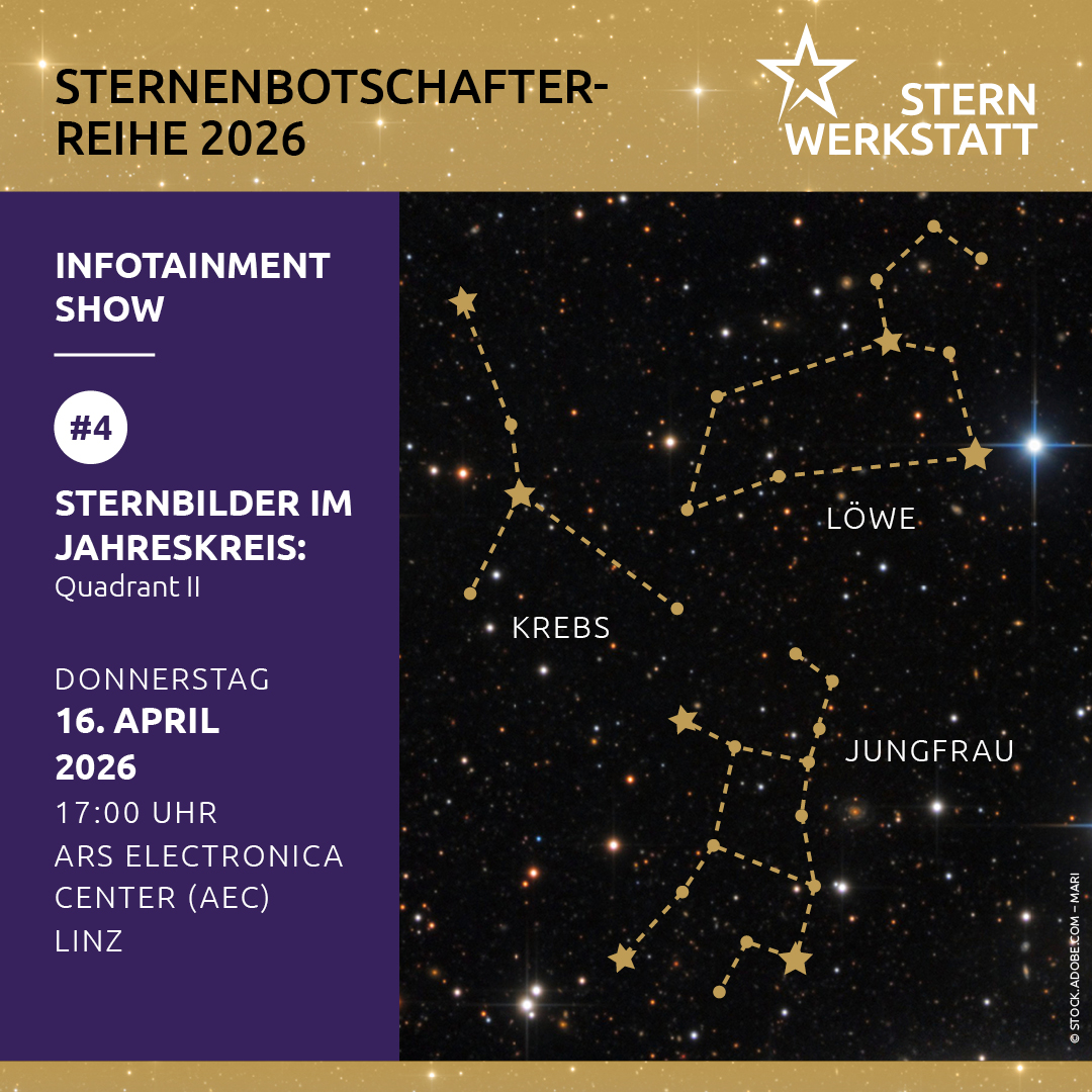Die „STERNENBOTSCHAFTER-Reihe 2026“ lädt Sie ein, in zehn eindrucksvollen Veranstaltungen die faszinierende Welt des Universums zu entdecken. Im einzigartigen Ambiente des Ars Electronica Center Linz / DeepSpace erleben die Teilnehmerinnen und Teilnehmer jeweils einstündige Einheiten, in denen Dr. Dietmar Hager, renommierter Arzt und international ausgezeichneter Astrofotograf, Wissen mit Medizin, griechischer Mythologie und Staunen verbindet.