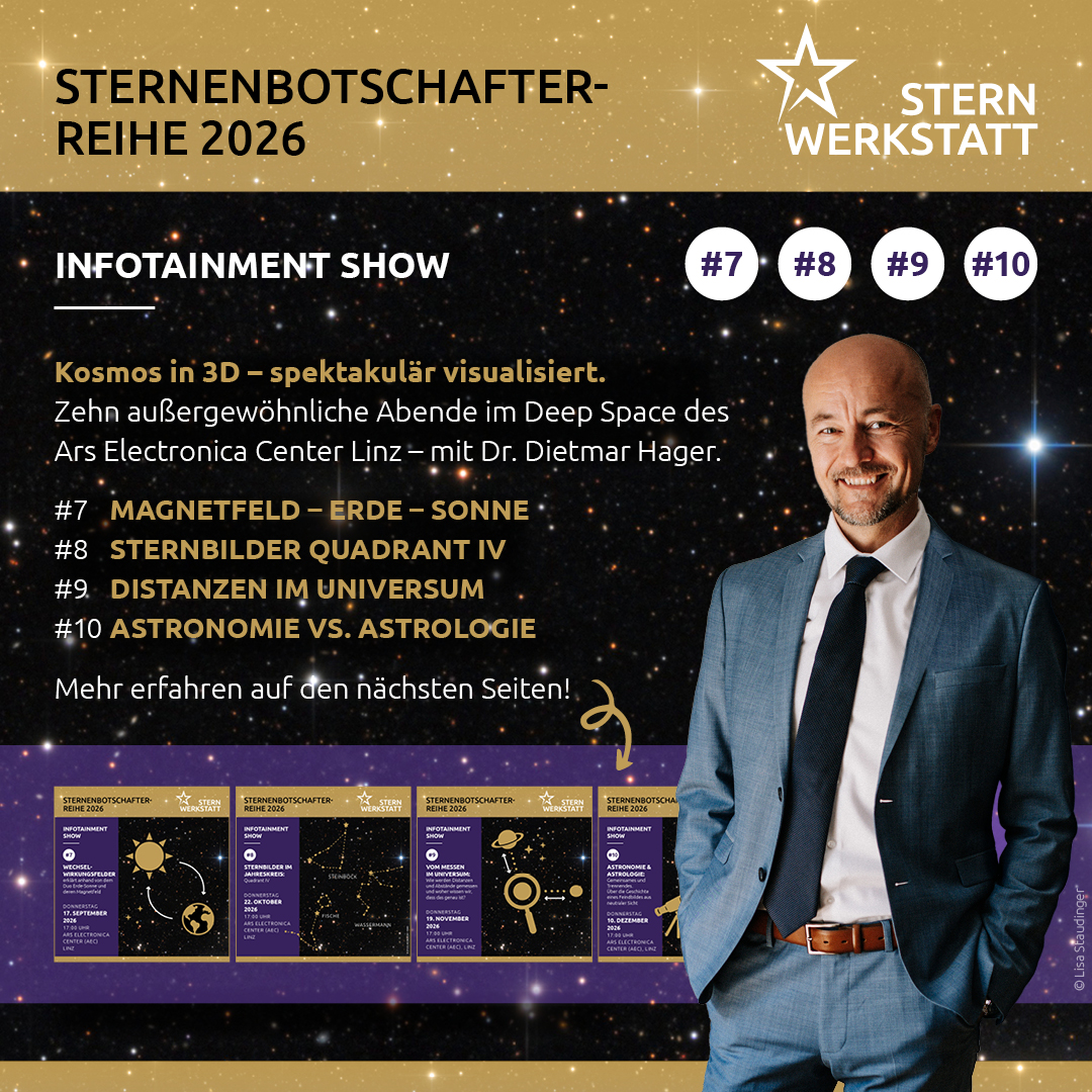 Die „STERNENBOTSCHAFTER-Reihe 2026“ lädt Sie ein, in zehn eindrucksvollen Veranstaltungen die faszinierende Welt des Universums zu entdecken. Im einzigartigen Ambiente des Ars Electronica Center Linz / DeepSpace erleben die Teilnehmerinnen und Teilnehmer jeweils einstündige Einheiten, in denen Dr. Dietmar Hager, renommierter Arzt und international ausgezeichneter Astrofotograf, Wissen mit Medizin, griechischer Mythologie und Staunen verbindet.