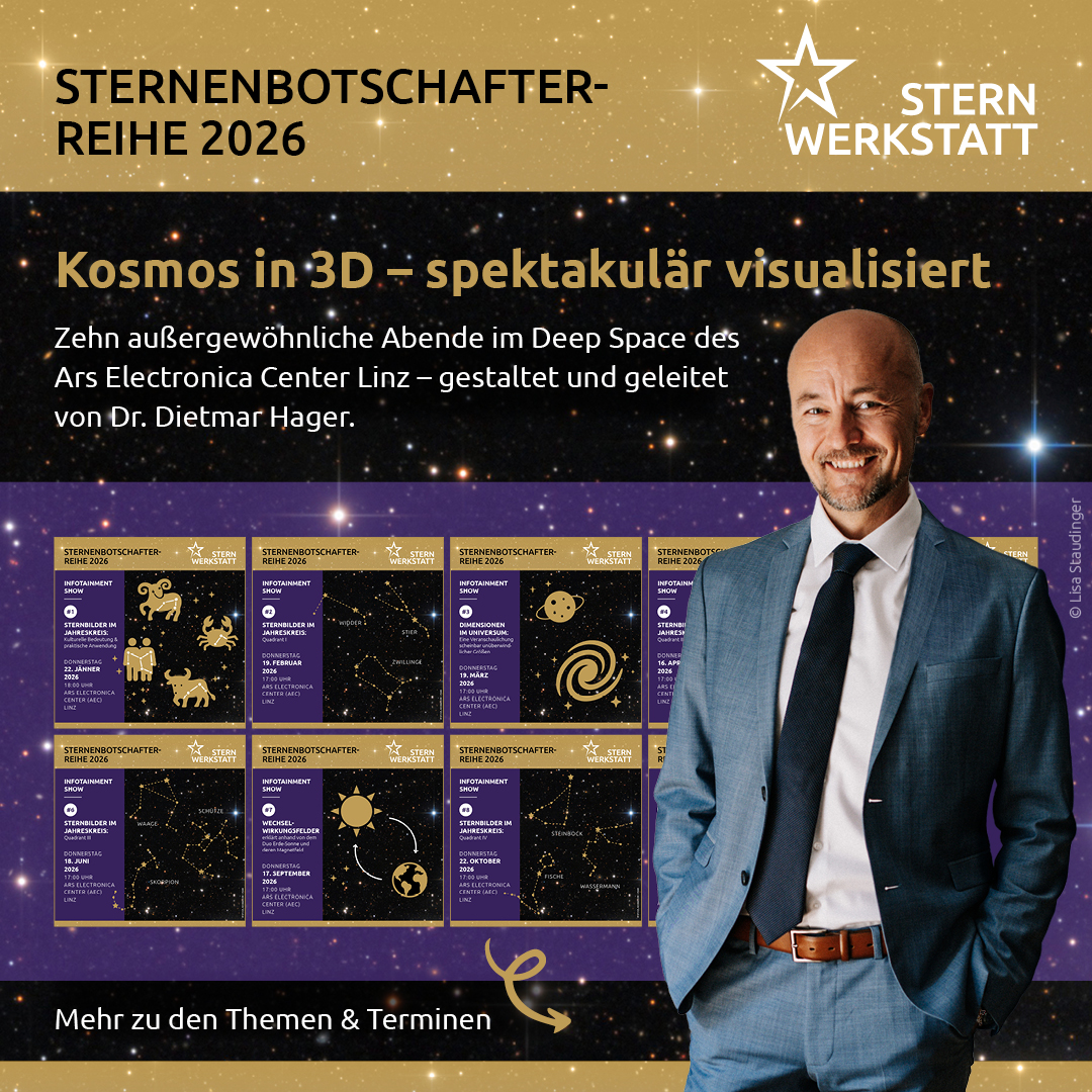 Die „STERNENBOTSCHAFTER-Reihe 2026“ lädt Sie ein, in zehn eindrucksvollen Veranstaltungen die faszinierende Welt des Universums zu entdecken. Im einzigartigen Ambiente des Ars Electronica Center Linz / DeepSpace erleben die Teilnehmerinnen und Teilnehmer jeweils einstündige Einheiten, in denen Dr. Dietmar Hager, renommierter Arzt und international ausgezeichneter Astrofotograf, Wissen mit Medizin, griechischer Mythologie und Staunen verbindet.