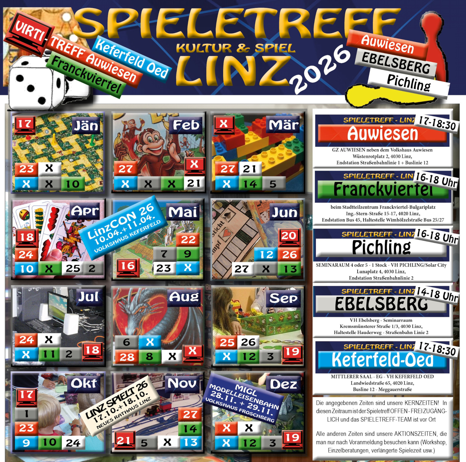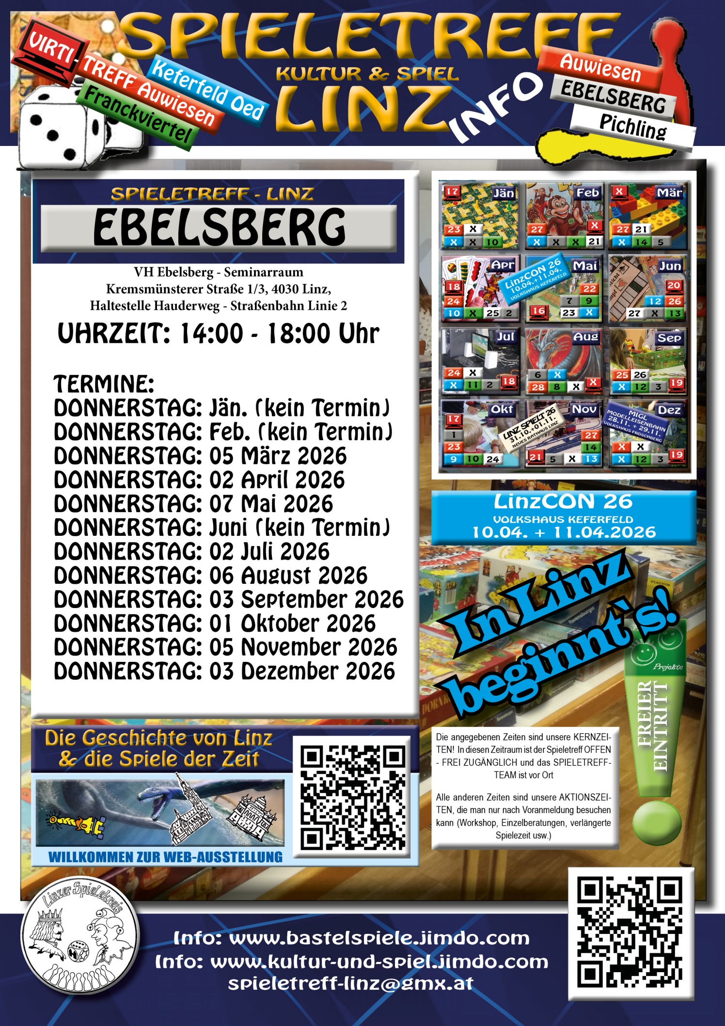 The Ebelsberg Game Meeting will start on Thursday, March 5, from 2:00 p.m. to 6:00 p.m. Afterwards, it will take place on the first Thursday of every month.