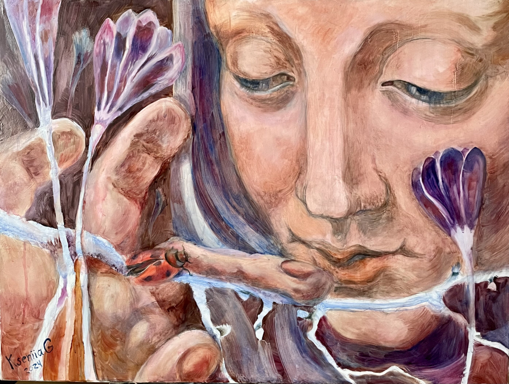 Die textilen Arbeiten von Margit Leeb und die Malerei von Kseniia Gerasimenko treten in einen feinen Dialog. Linien und Fäden setzen sich in den gemalten Formen fort.