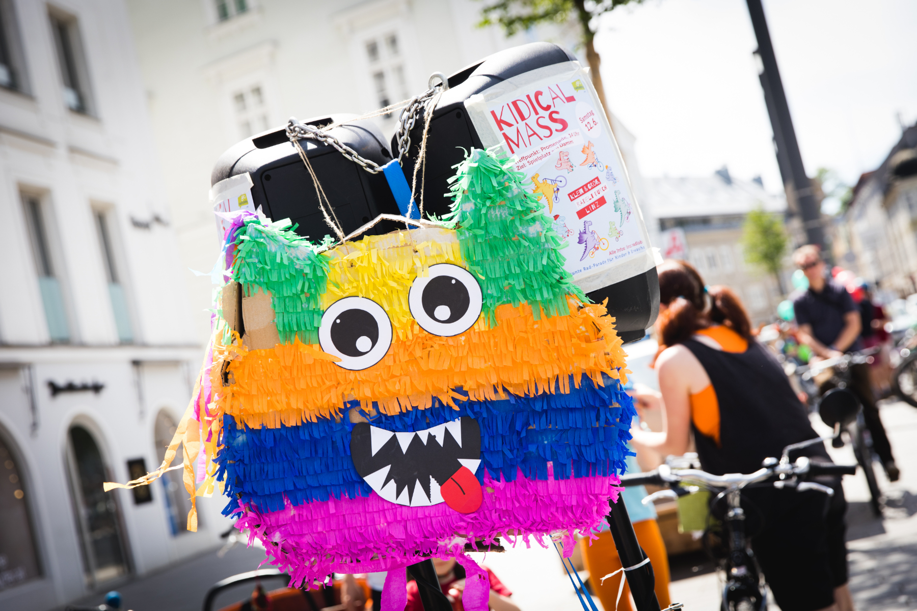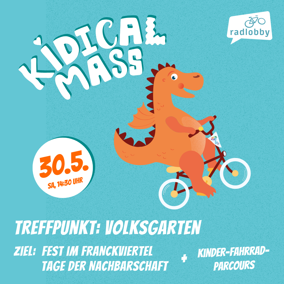 - Die Teilnahme erfolgt auf eigene Gefahr: Die Kidical Mass findet auf breiten Straßen statt und wird von der Polizei kindergerecht abgesichert. Bitte passt trotzdem gut auf euch und eure Kinder auf.