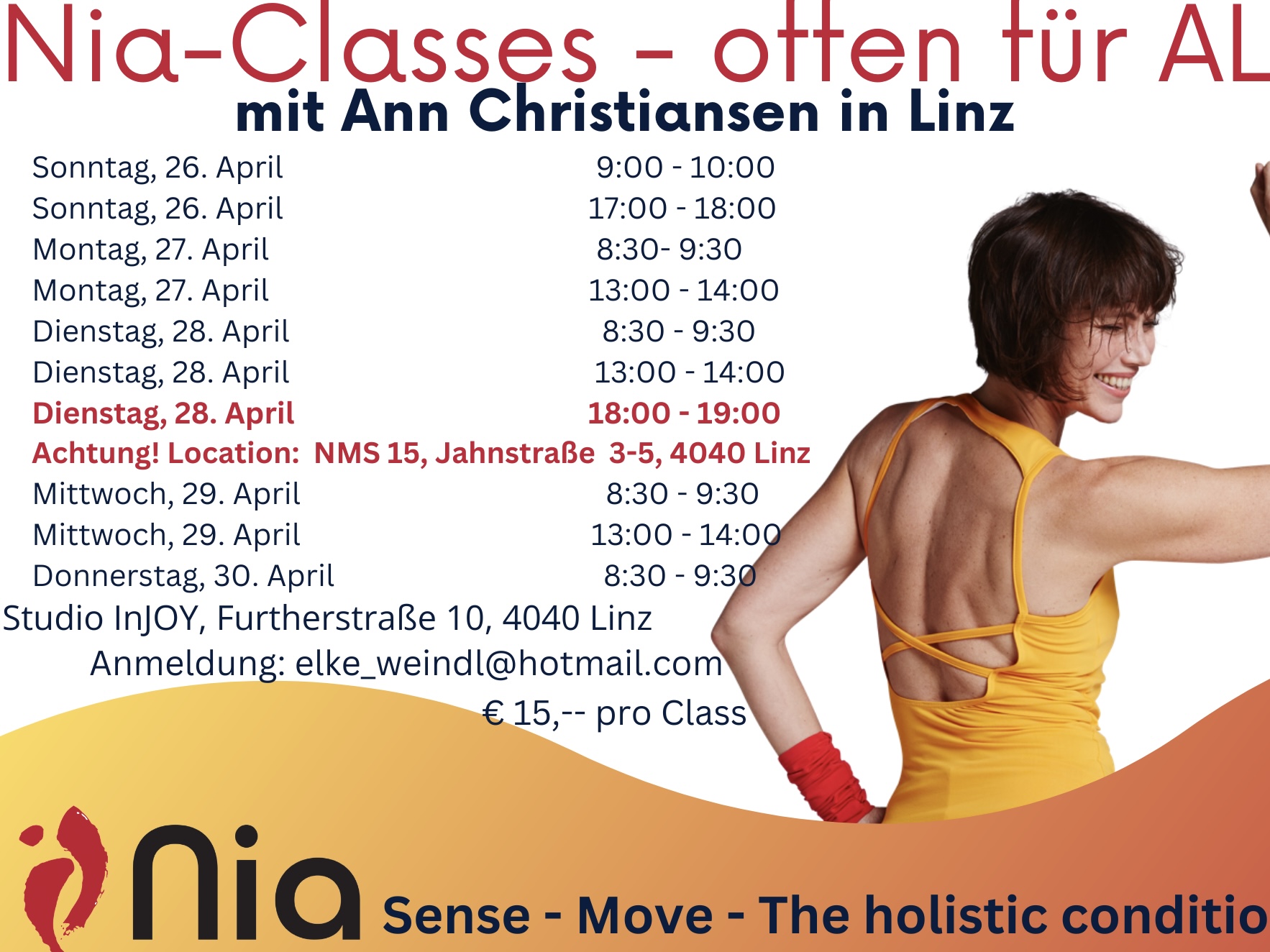 ACHTUNG! Die Nia-Einheit am Dientag Abend, von 18:00-19:00 findet in der NMS 15 - Leonardo Da Vinci Schule, Jahnstraße 3-5, 4040 Linz statt.
