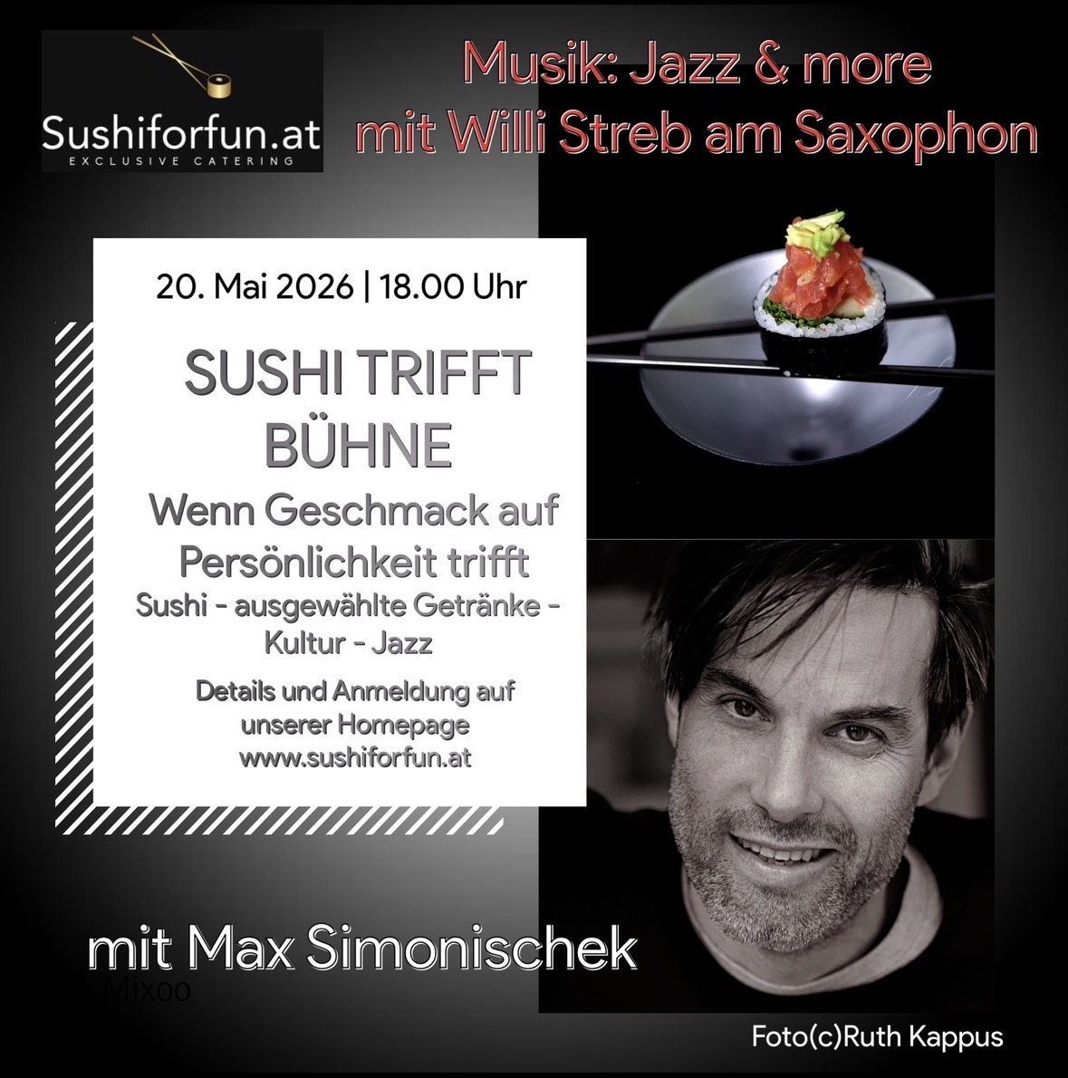 Genießen Sie einen Abend in der Atmosphäre des Bergschlössls. Lassen Sie sich von Sushi-Meister Marius mit ausreichend Sushi kulinarisch verwöhnen, verkosten Sie die darauf abgestimmten Weine und hören Sie Willi Streb am Saxophon. Das Highlight ist dann TV-Star und Burgschauspieler Max Simonischek, der aus seinem Repertoire liest.